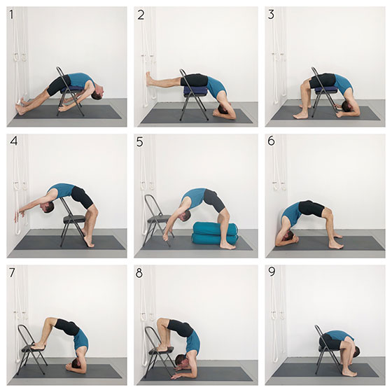 This class guides you through a series of key Iyengar Yoga backbends including dwi pada viparita dandasana, urdhva dhanurasana and vrschikasana. Emphasis is given to entering each pose in clearly defined, methodical stages. Rather than prioritising the final position, each stage in the process of building a balanced pose is given equal importance. A chair is utilised in most of the poses in this sequence. In more preparatory backbends the chair is used to create opening in your chest and upper back. It is then retained in more advanced poses to give you the option of penetrating more deeply into the pose.