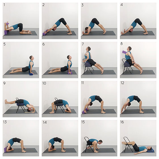 In this weeks advanced class we are working on wrists and shoulders from the perspective of backbends. In the early section of the class some challenging variations of adho mukha svanasana are used to help improve wrist mobility. These poses will be helpful in terms bringing about change, and cutting through stiffness. Some adaptations of urdhva mukha svanasana follow. These variations are less about challenging the wrists, and more about how this pose can be adapted so as to take pressure of the wrists. The next section of the class uses chair backbends to focus more on shoulder opening. Urdhva dhanurasana allows you to simultaneously work on shoulders and wrists. Some variations are shown that will be helpful for anyone practicing with restricted mobility in these areas. The class builds eventually towards dwi pada viparita dandasana and chakra bandhasana. All of the poses in this sequence are explored in terms of their impact on shoulders and wrists.