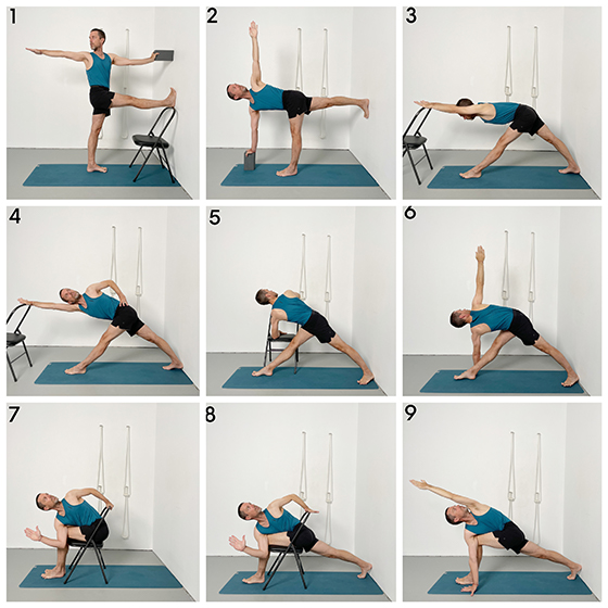 Parivrtta trikonasana, parivrtta ardha chandrasana, parivrtta parsvakonasana.