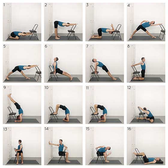 Chair yoga sequence. A chair is the only prop used in this weeks class. A specific yoga chair is used in this video but many regular domestic chairs could also be utilised. A variety of poses are explored in the sequence but backbends are the main focus of the class. Poses that help to open your shoulders and chest are explored at the beginning of the sequence and back releasing twists at the end. Vrschikasana is the culmination of the backbend section. The class is particularly well suited to home yoga practitioners with limited access to yoga props. The chair helps to give you access to poses that might otherwise rely on specialised equipment or complicated set-ups.