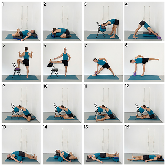 Supported standing poses, supported forward bends, reclining restorative poses.