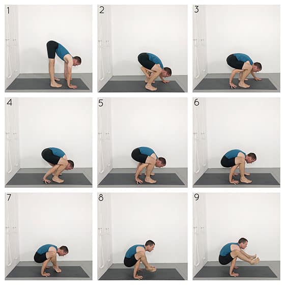 - It is during this transition that many people find that they lose balance in a backward direction. To prevent this from happening, squeeze both knees firmly against your shoulders as you lower your hips, and keep your head forwards as a counterweight with your eyes looking down