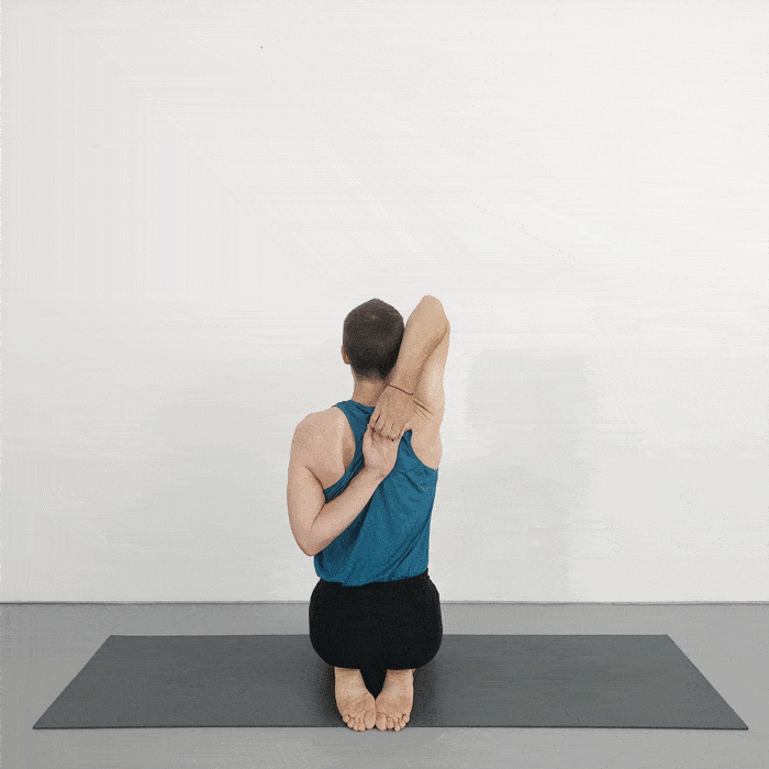 This arm action is used here from a kneeling position, but is also commonly combined with an upright standing posture. The same arm position and techniques are used in standing poses such as vrksasana and virabhadrasana I.